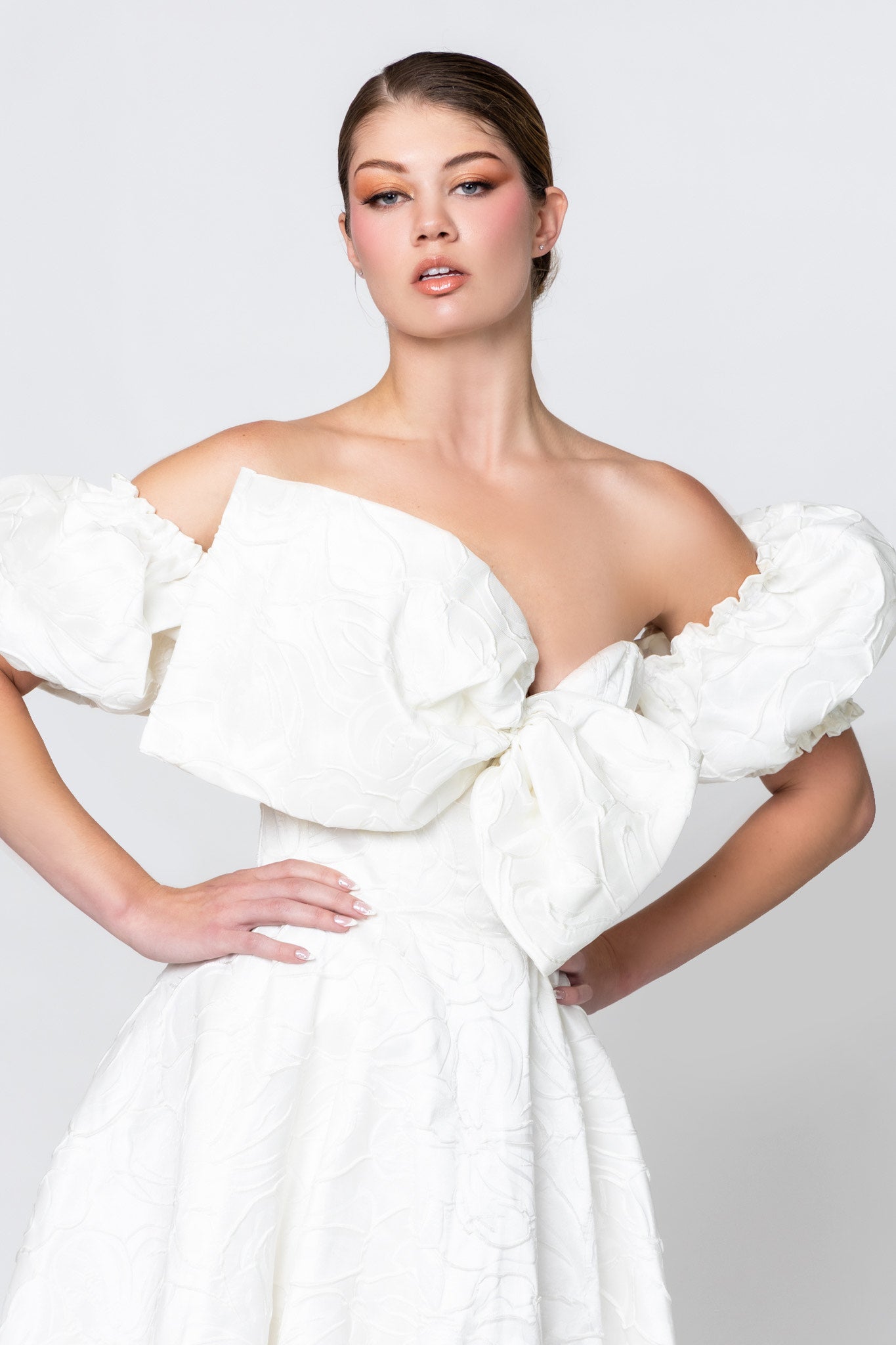 A vision of modern romance, the Blossom Cloud dress features sculptural puff sleeves, a dramatic bow bodice, and a flowing high-low hem.