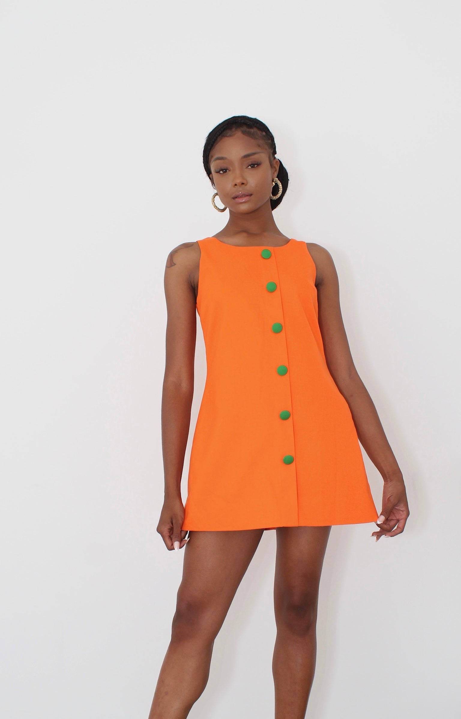 Step into the spotlight with the Disco Pop Dress-a 70s-inspired mini featuring a bold orange hue and statement green buttons. Fun flirty, and to move.