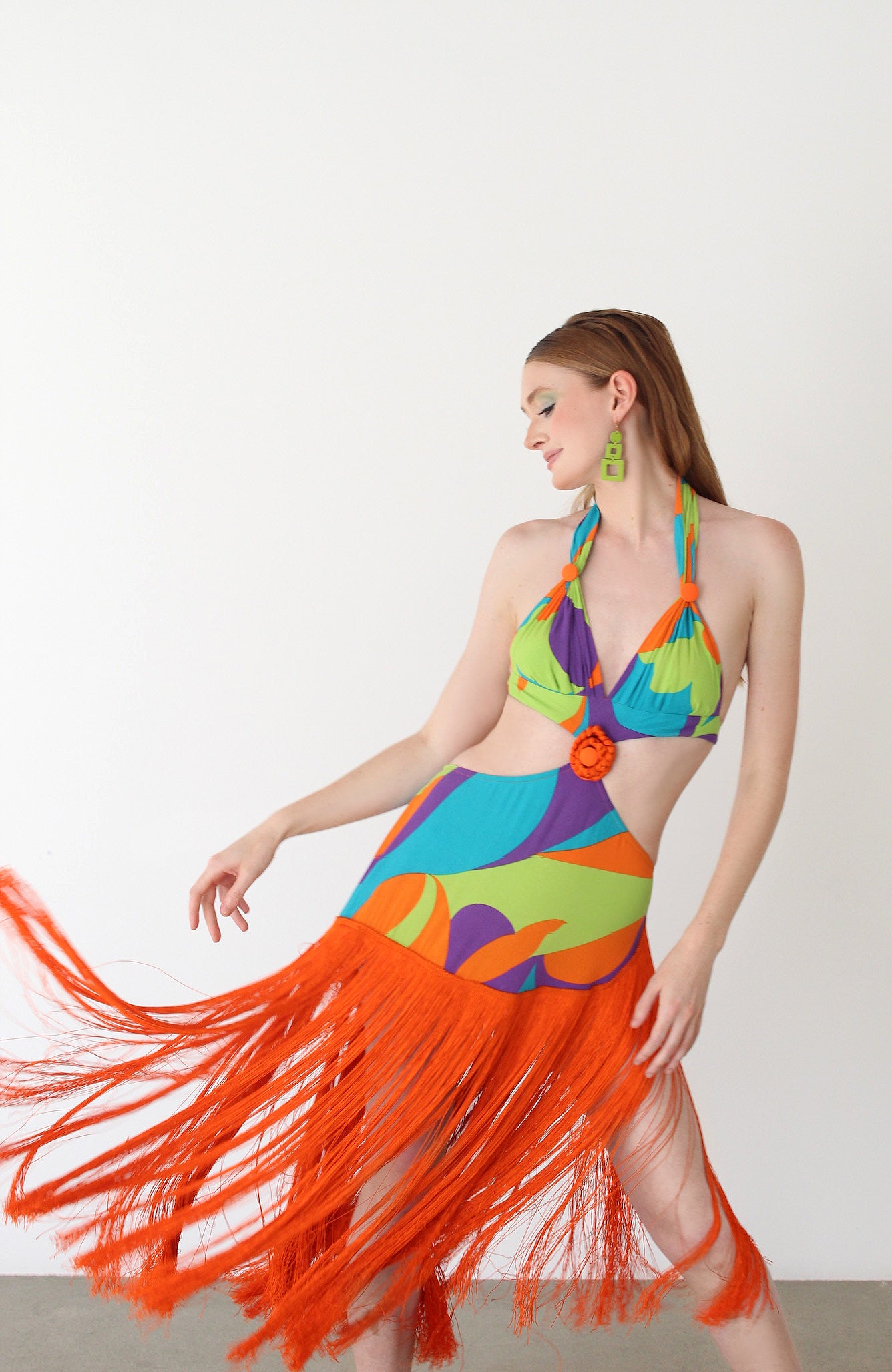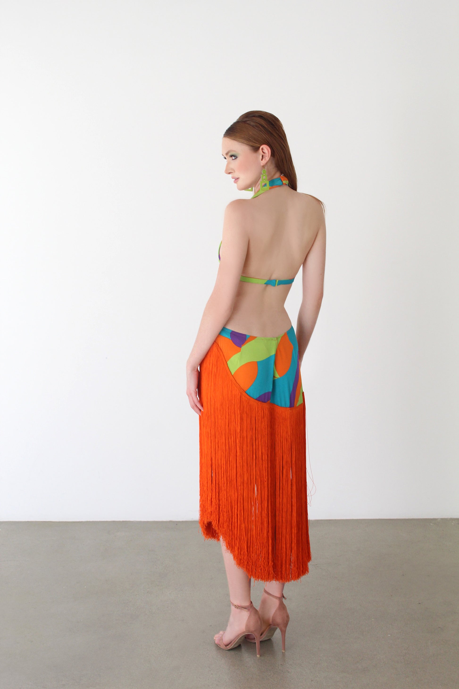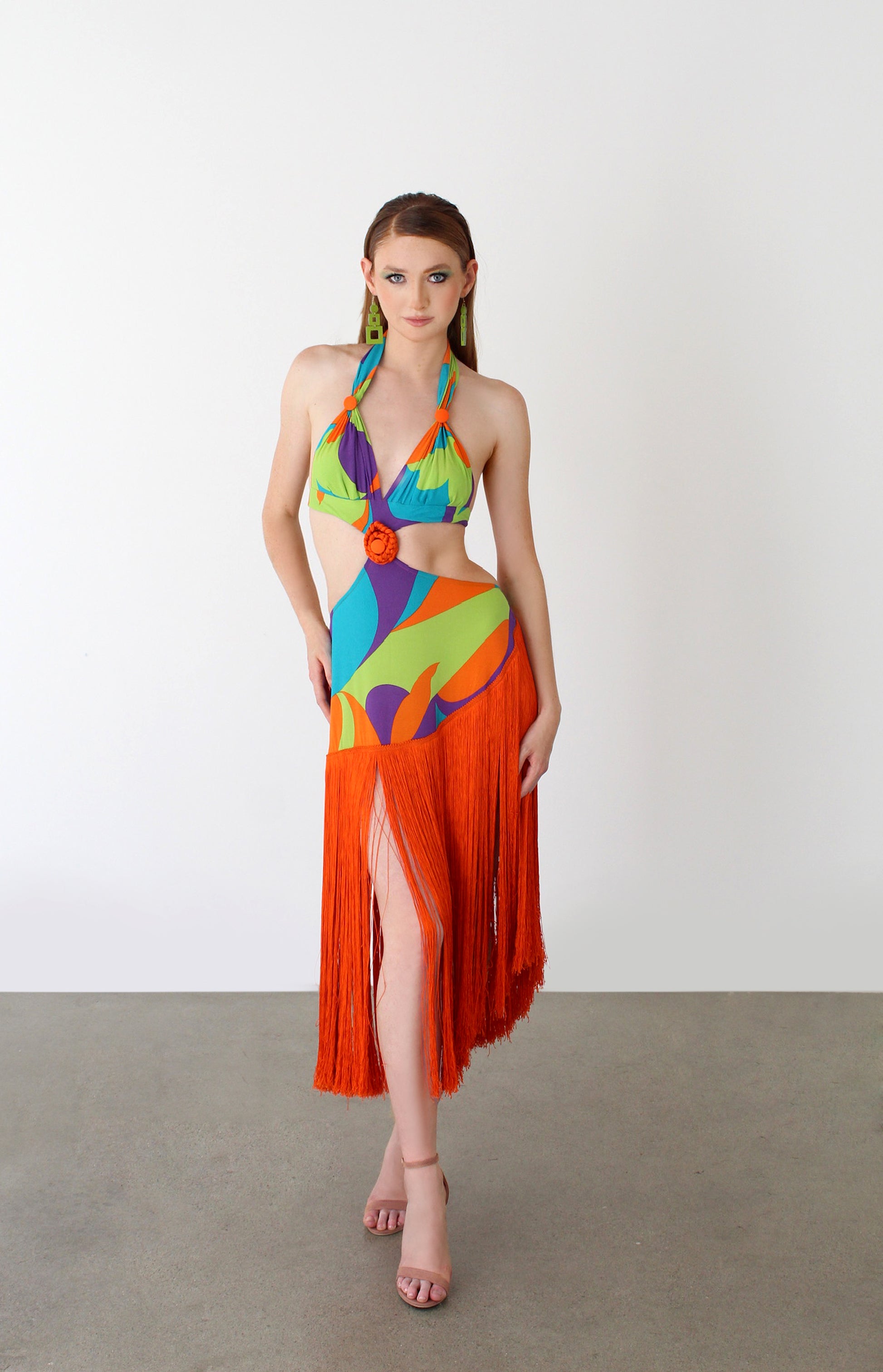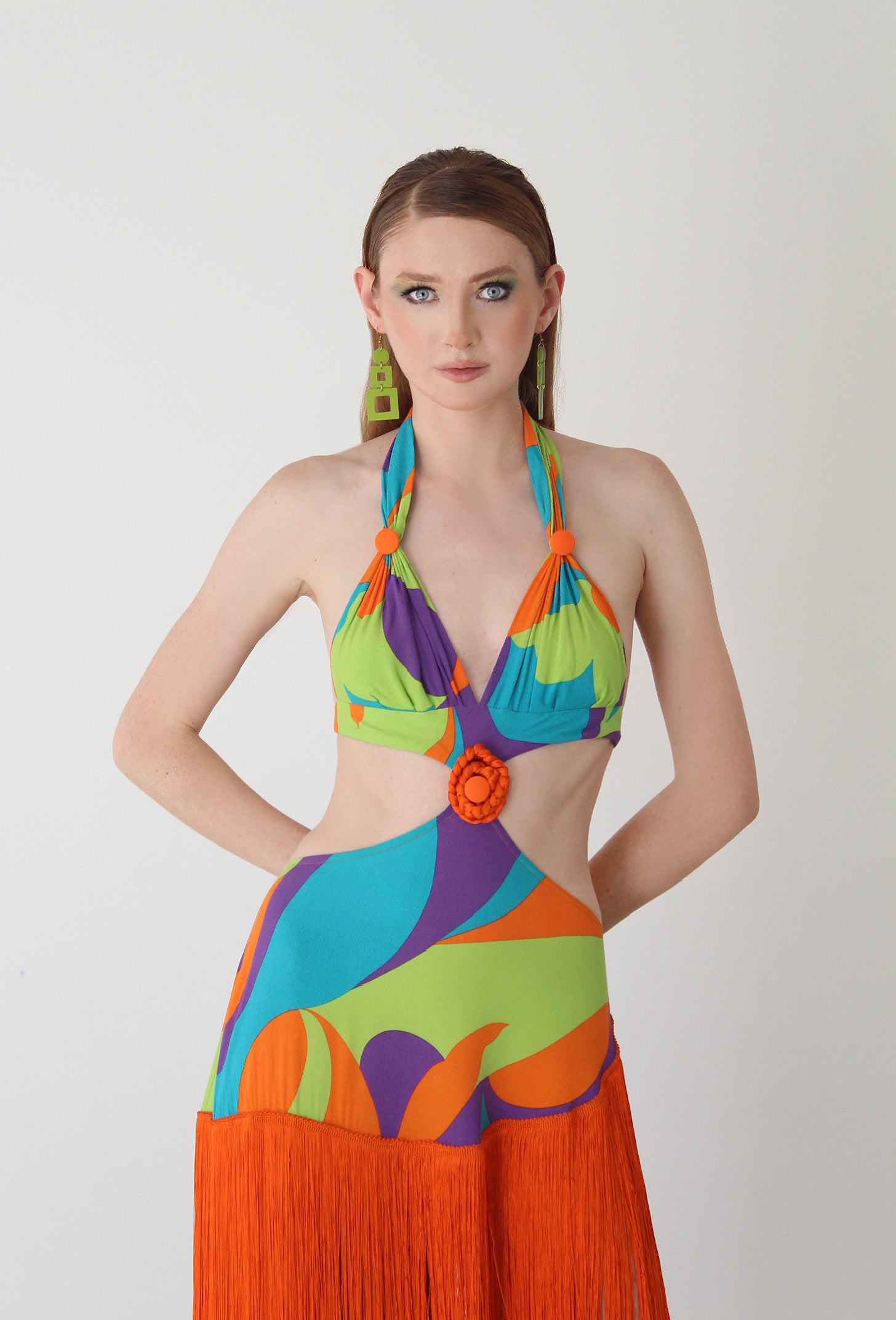 The print is pure 70s euphoria:lime green, electric blue, fiery orange,and and royal purple swirl like vinyl spins under club lights.