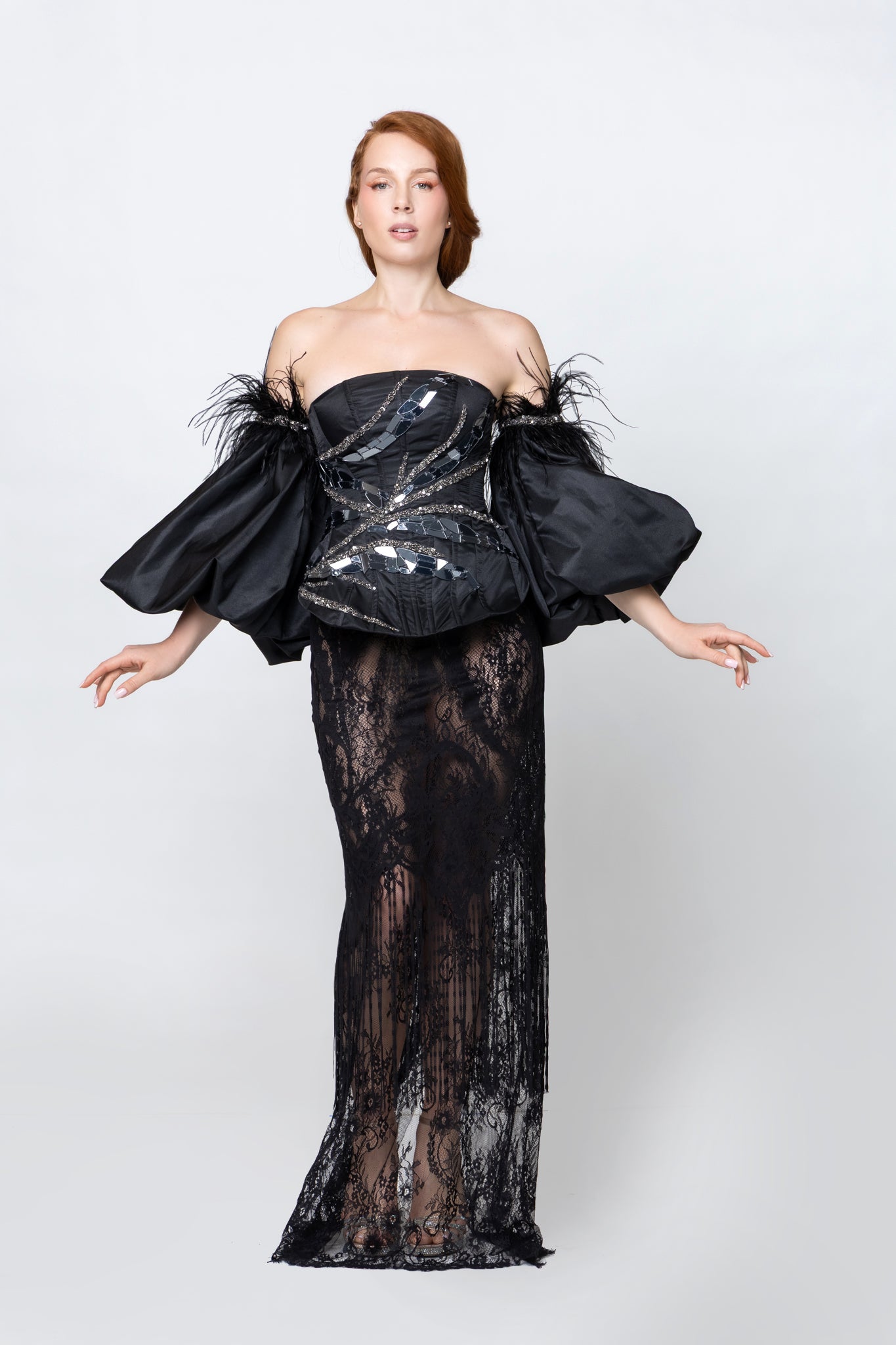 The structured off-shoulder corset is adorned with hand-applied mirrored embellishments and soft black feathers, paired with a sheer lace skirt that adds sensual movement and sophistication.