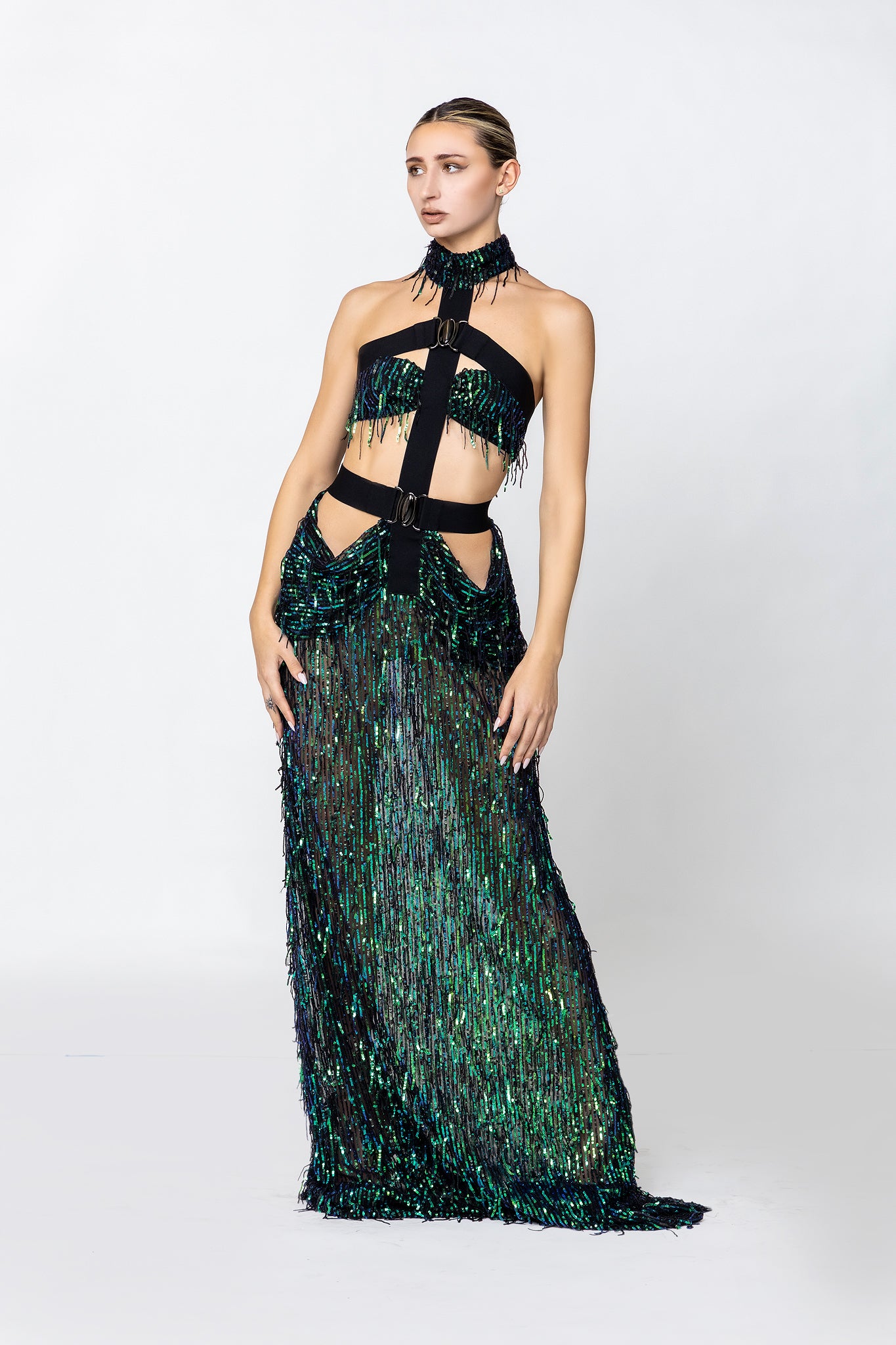 This handcrafted design features shimmering emerald and midnight - blue sequin stretch fabric, hugged with sleek black elastic bands and bold metallic ring details.