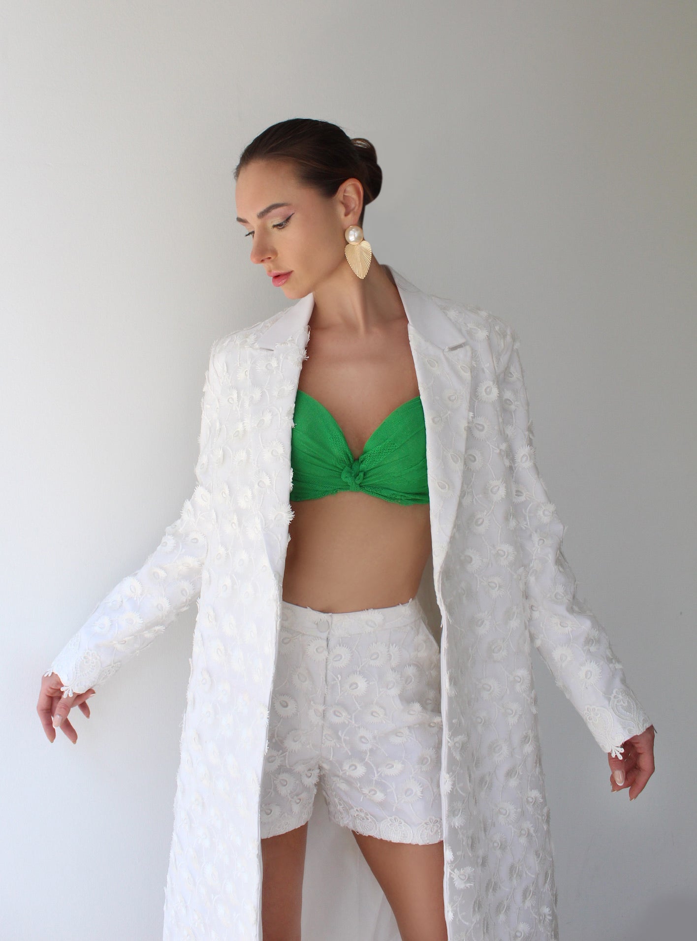 The White Bloom set blends bold femininity with crisp tailoring.Crafted in rich embroidered floral fabric, this-three-piece look features tailored shorts, a statement long coat, and a vibrant green bralette for a fresh twist.